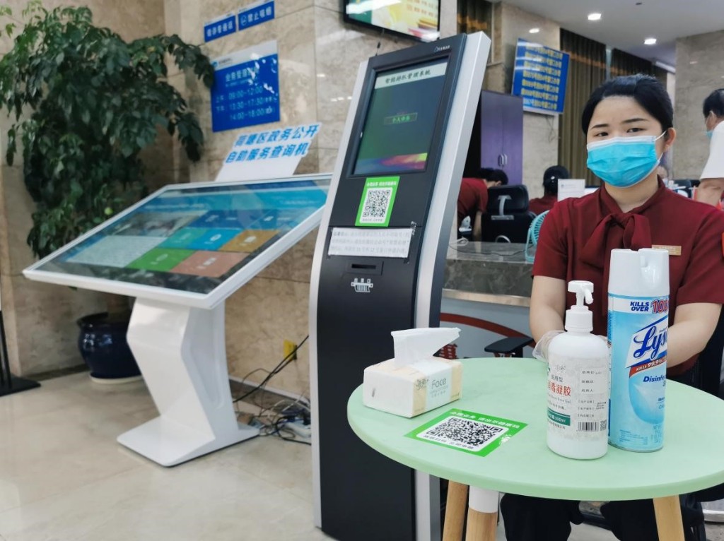 一是筑牢疫情“警戒线”。7月底,对进入政务大厅的办事企业和群众实施体温监测,在大厅门口设置测温点,入口处醒目位置设提示牌、指引牌,要求外来人员严格按照要求佩戴口罩,进行酒精消毒,并详细查询健康码、行程码等信息,确认核对后方可进入政务大厅。