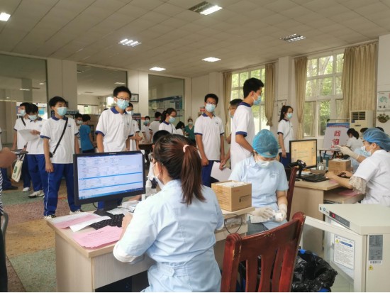 接种现场,学生们按照班级预先的安排时间有序排队,全部遵循间隔一米线距离进行登记、接种以及留观30分钟后离场,整个接种过程井然有序、快速高效。当天下午桂花中心就为该校学生接种800余人。