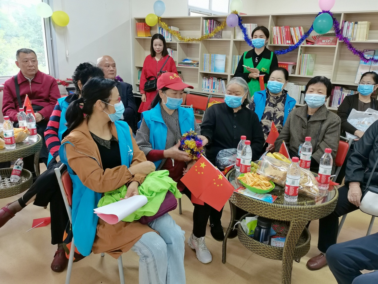 活动上,热情的笑容、五彩的气球、飘扬的彩带、满桌的水果零食,为辖区居民、长者送去了浓浓的爱意和节日惊喜。街道“心晴计划”项目志愿者带来开场舞《功夫扇》,他们气定神闲,动作轻盈,一招一式干净利落,尽显良好的精神面貌。街道老年大学的长者们带来合唱《大阪城的姑娘》,饱含深情的歌声和朴实的情感赢得了在场观众的阵阵掌声。互动游戏“击鼓传花”瞬间点燃了现场气氛,在志愿者的鼓励下,老人们积极踊跃参与游戏,歌唱一首首经典难忘的歌曲。