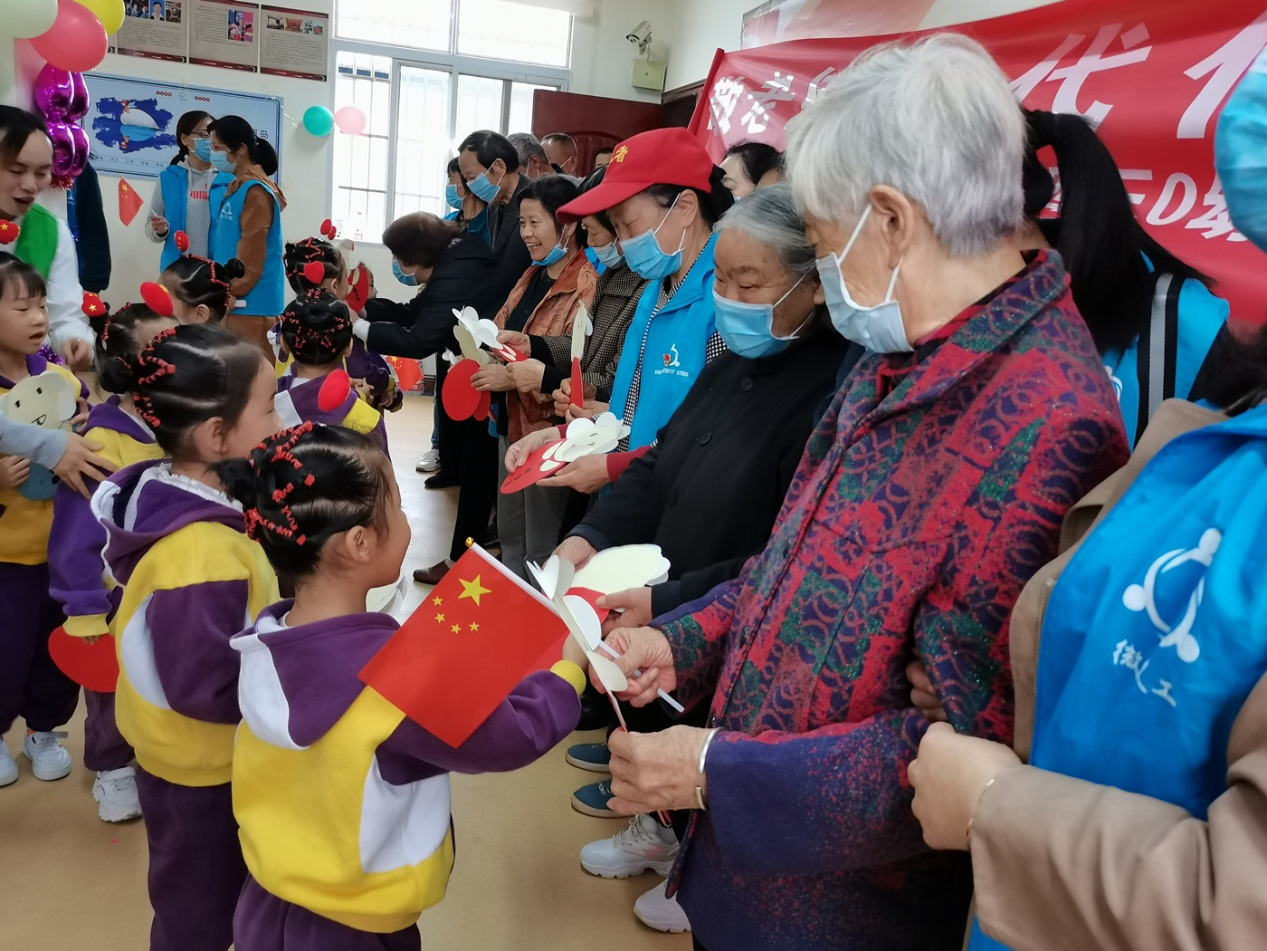 在这个特别的日子里,来自八达小学、四三零幼儿园、金荷幼儿园的孩子们为老人们送上了温暖的礼物。独舞《鱼儿》、独奏《小萝曼丝》、舞蹈《中华孝道》《手牵手》《爷爷亲,奶奶亲》等,老人们跟随婉转的音乐、轻快的舞蹈,轻轻打着节拍,享受音乐和舞蹈的美好。四三零幼儿园的孩子们还为老人们送上亲手制作的小礼物,听到孩子们稚嫩的祝福声,接过可爱的手工卡片,老人们露出了开心的笑容。活动最后,大家纷纷扬起手中的国旗,集体合唱《我和我的祖国》,把对祖国的深切热爱和美好祝福化为流淌的动人旋律,每一个人的脸上都洋溢着幸福灿烂的笑容。