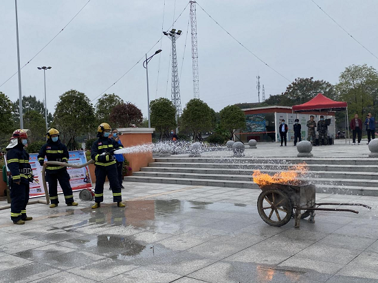 几分钟后,空袭警报持续长鸣,所有学生迅速双手抱头蹲下,保持此姿势不改变。现场还模拟了应急救助,由医生为伤者进行心脏复苏和包扎,科普应急救助手段和知识。紧接着,消防员利用水枪及灭火器对现场的模拟火场进行灭火,不一会儿便成功扑灭。随着解除警报的响起,全体师生起身列队,此次演练也圆满结束。