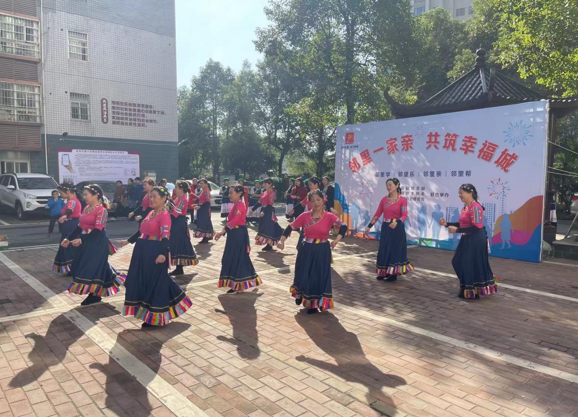 活动现场热闹非凡,大家都被精彩的表演所吸引。社区工作人员积极宣传一门式、智慧荷塘APP下载、禁毒、防诈骗、垃圾分类等知识。同时,一支由舞姿翼艺术团带来的舞蹈《情深谊长》,也生动演绎了红军长征时彝族与红军之间的军民情,让"邻里一家亲• 共筑幸福城"活动完美落幕。