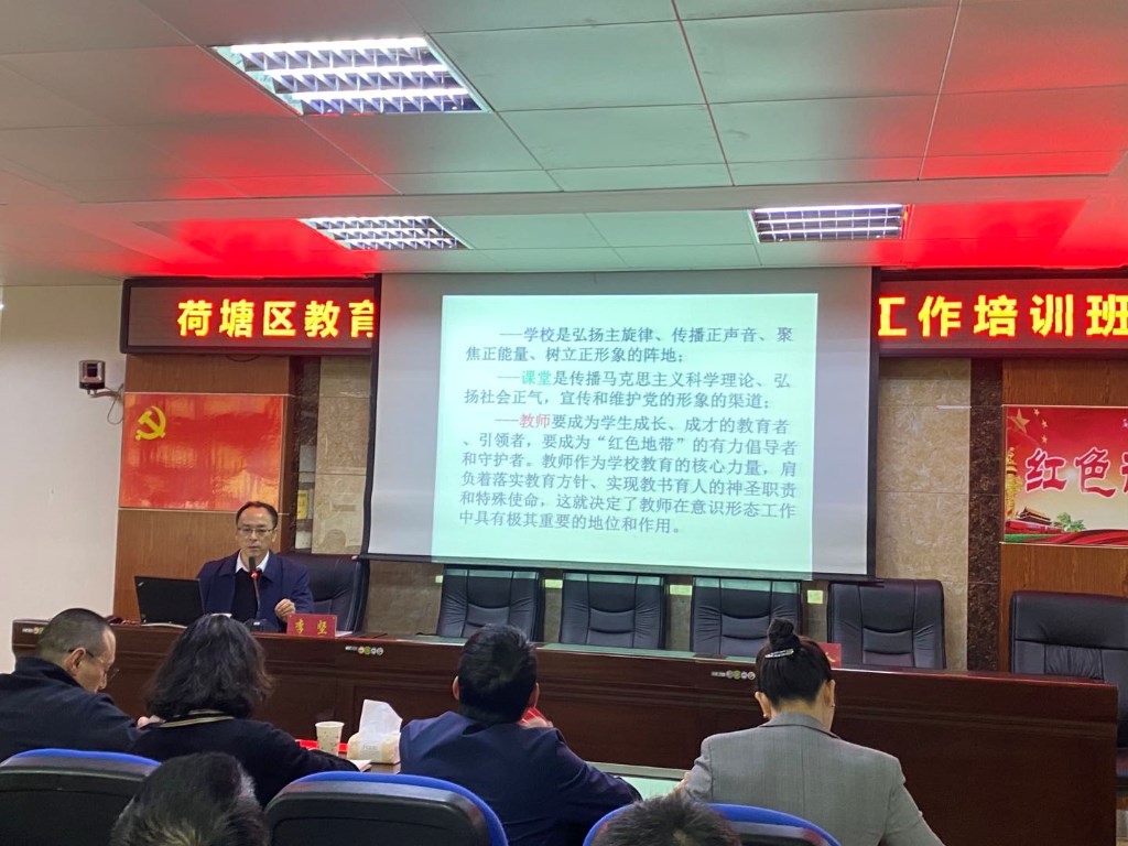 11月23日上午,荷塘区教育局党委组织开展意识形态工作专题培训,邀请株洲市委宣传部意识形态科科长李坚作专题讲座。区教育局在家班子成员、相关股室成员以及基层党组织书记参加培训。培训会由区教育局党委书记、局长周波主持。
