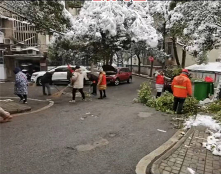 志愿者们在小区内铲雪