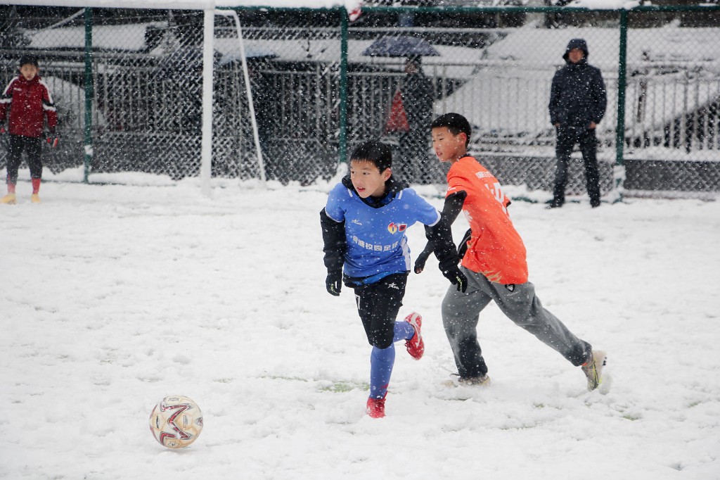 尽管天空飘着大片雪花,但孩子们仍然准时出现在了白雪皑皑的绿茵场上。