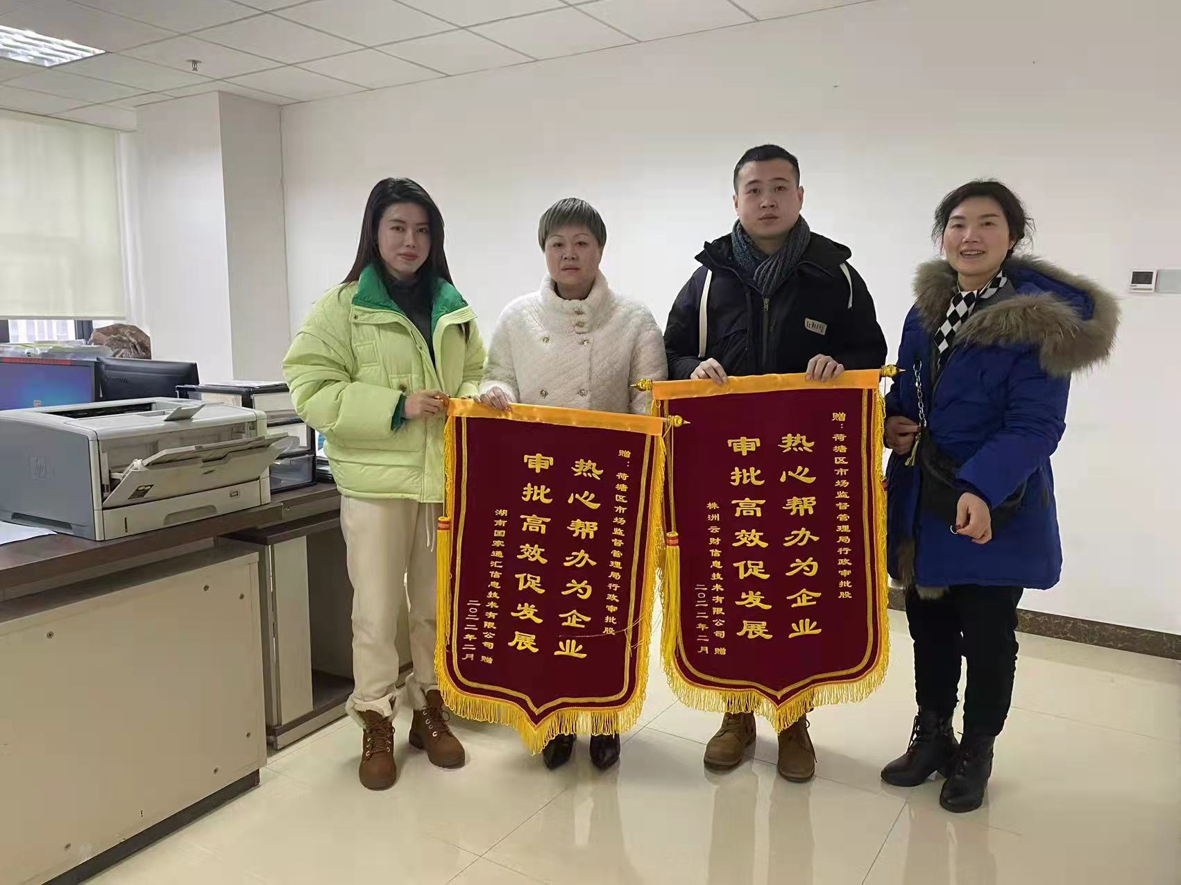 “集群注册的新政策如及时雨,解决了我们企业平台用户落户登记难题!集群注册轻松化解发展困扰,让我们倍感温暖......”2月14日,湖南国金通汇信息技术有限公司及其子公司株洲云财信息技术有限公司负责人将一面印有“热心帮助为企业,审批高效促发展”的锦旗,送到荷塘区市场监督管理局行政审批股室。