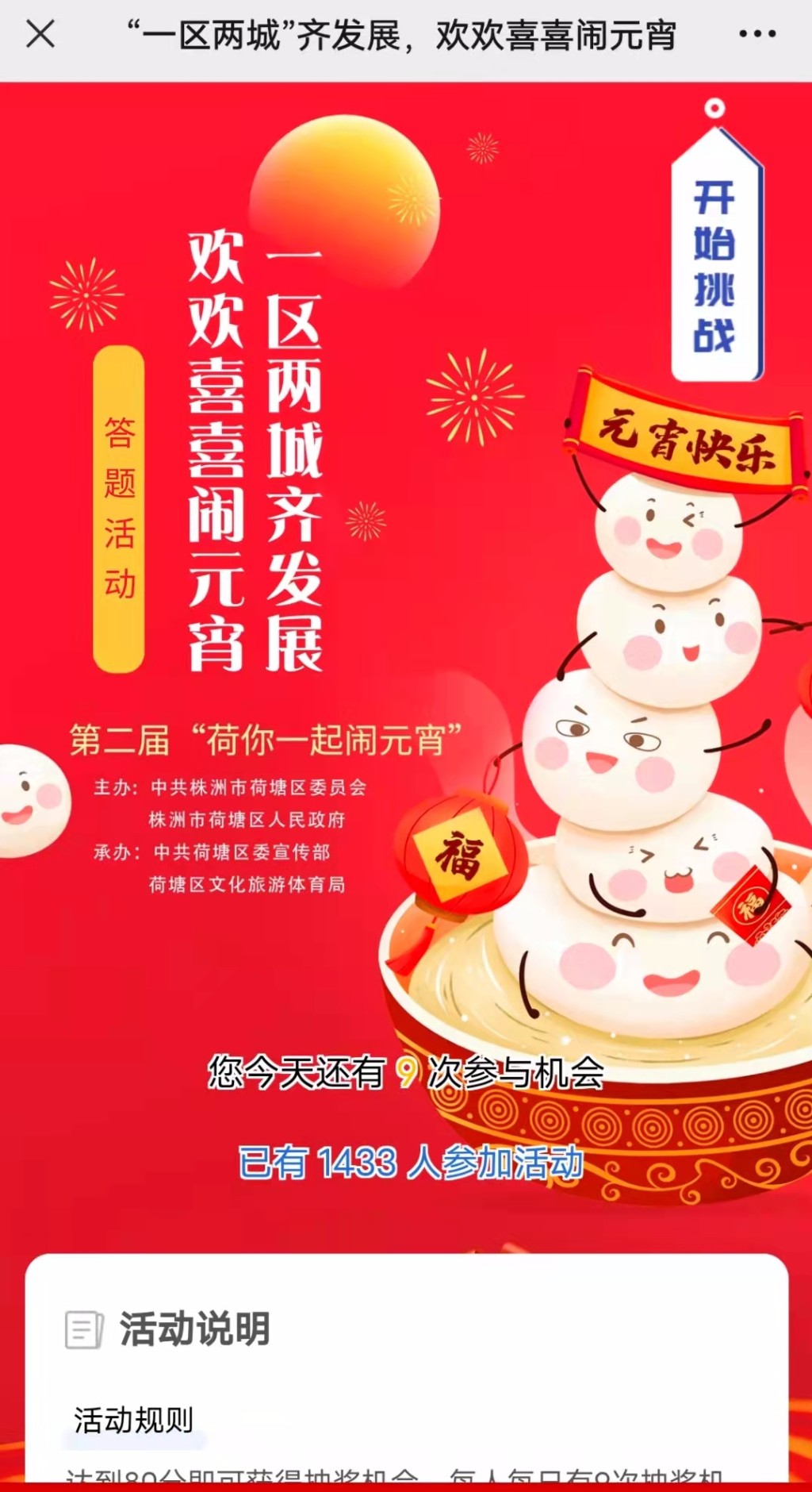 1月31日至2月15日,荷塘区推出第二届“荷你一起闹元宵”系列活动,此次活动是由荷塘区委、区政府主办,荷塘区委宣传部、区文化旅游体育局承办。旨在疫情常态化防控期间,通过组织丰富多彩的线上公共文化服务活动,让人民群众度过一个喜庆平安、欢乐祥和的春节。