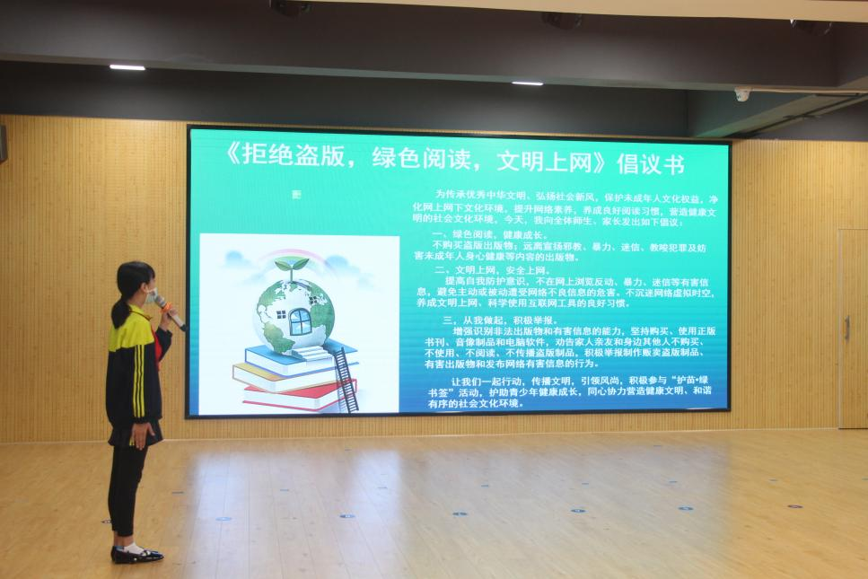 活动中,来自六年级312班的吴芊儿同学慷慨激昂地宣读了《拒绝盗版,绿色阅读,文明上网》倡议书。她号召同学们将倡议化为动力,自觉抵制盗版书籍、不良刊物及网络有害信息,倡导绿色阅读,用自己的实际行动来传承人类文明,共创书香校园。