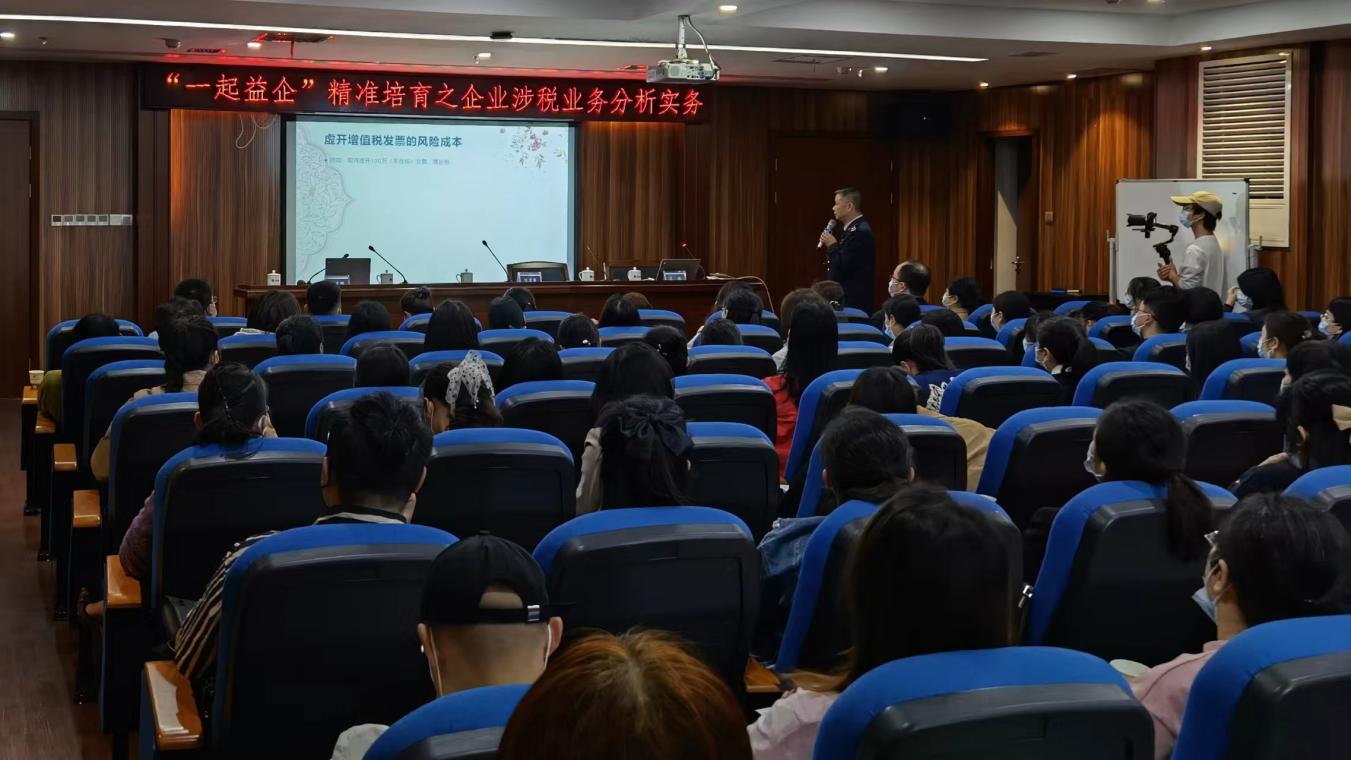 此次培训活动特邀区税务局党委委员、副局长肖曦作为讲师,培训从税务部门职能、大数据下的税务分析、税收发票的风险防范以及如何规避风险等方面展开。肖曦通过对虚开发票的真实案例进行分析,讲述企业增值税发票虚开风险,提醒企业可通过自查、信用救济等方式防范风险。