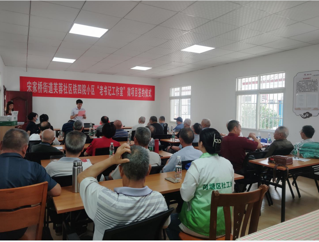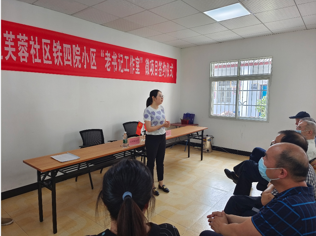 6月8日下午,“老书记工作室”微项目签约仪式暨启动会议在铁四院小区顺利举行,宋家桥街道党工委副书记董婉璐、驻铁四院小区第一书记李诺男、铁四院工程勘察院长株实业发展部负责人、芙蓉社区工作人员、小区党支部全体党员以及小区志愿服务队参加本次会议。