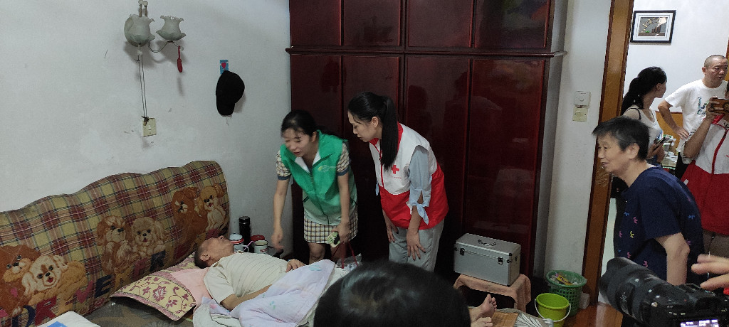 最后主持人隆重宣布株洲市首个红十字志愿服务点在晏家湾社区成立,株洲市红十字会的志愿者代表们面向中国红十字会会徽,举起右手庄严宣誓,许下郑重承诺:尽己所能,不计报酬,帮助他人,服务社会。随后,大小志愿者们一起开展了服务点成立的第一次活动,走访社区两位行动不便的参战老兵,送去了慰问物资和节日的祝福。专业的志愿者还对他们进行血压、血糖等健康检测,根据老兵的身体状况,给予了一些生活习惯和饮食上的指导。