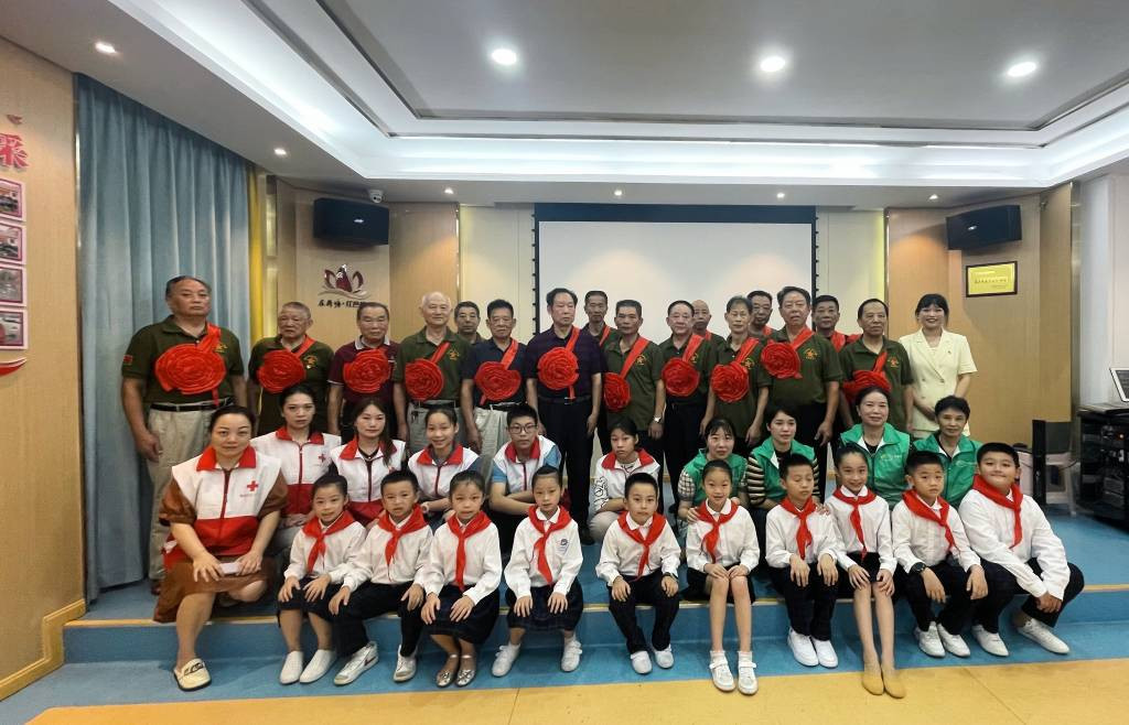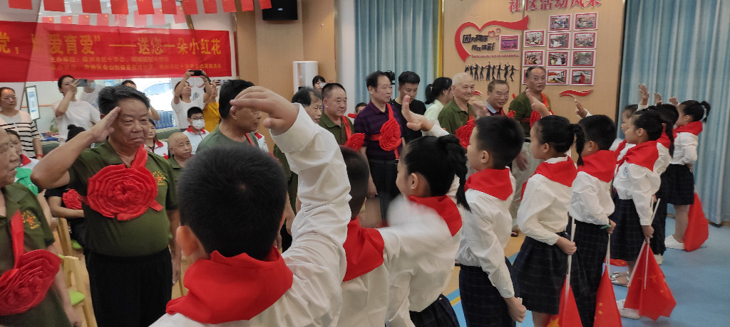 活动伊始,经历过战火硝烟的沈时新老人讲述着他的故事,带我们重温过去,感受那段历史。轰鸣的炮声,飞驰的子弹,战士们坚不可摧的意志,老兵们满脸的骄傲,孩子们满眼的佩服,他们也通过给退伍老兵佩戴大红花的方式表达着自己的敬意,一首《祖国盛世,如您所愿》让全场的气氛达到了高潮,孩子们通过诗舞颂还原了刻骨铭心的激情岁月,用朗诵祝福祖国和军队,优美的舞姿、高昂的朗诵……老兵们雷鸣般的掌声充满着对新时代青少年的肯定与希望。表演结束后老兵们上台给孩子们系上了红领巾,希望他们系好人生第一粒纽扣,继承和发扬解放军的光荣传统和优良作风,带着革命先辈的坚韧不拔走进将来的学习和生活。