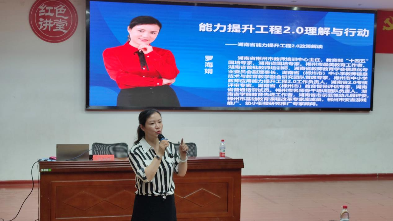 本次培训课程由中国教师研修网胡伊蓉专家的讲座《湖南省中小学教师信息技术应用能力提升工程2.0项目方案解读及平台操作》、郴州市教师培训中心主任罗海娟专题讲座《湖南省能力提升工程2.0政策解读》、郴州市教育局黄星老师的讲座《信息技术应用和常见问题》、长沙市芙蓉区东郡小学副校长曾宪梅专题讲座《信息技术2.0整校推进的有效管理策略》、长沙市第十一中学语文教师谢雅丽专题讲座《求术、问道》组成,专家们分别从解读研修方案、能力提升工程、信息技术与学科融合创新、整校推进信息化能力策略等方面与全体学员进行分享。授课专家们以深入浅出的案例,生动的讲解,为各校在开展教师信息技术应用能力提升工程2.0工作指明了方向、提供了方法。