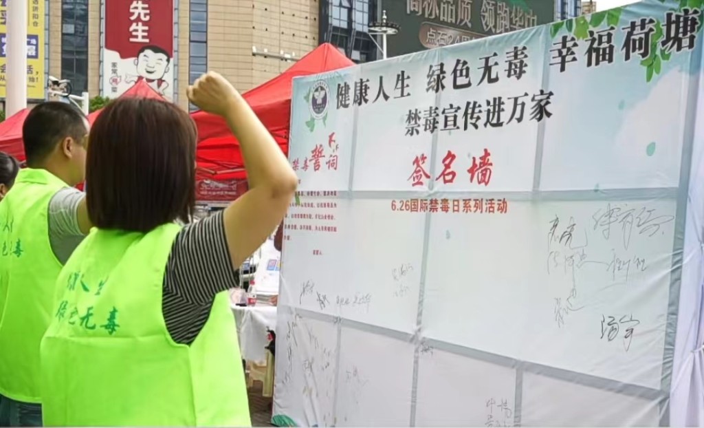 荷塘区妇联在辖区开展了内容丰富、形式多样的禁毒宣传进万家群众性禁毒宣传教育活动。一是拓宽禁毒宣传渠道。线上通过荷塘区妇联爱莲盟微信公众号发布禁毒知识信息、视频,发动妈妈禁毒志愿者参与省禁毒办发起的禁毒知识答题挑战;线下通过张贴标语、悬挂横幅、制作宣传展板、发放宣传资料、禁毒知识讲座、参观禁毒教育基地、观看禁毒视频、等群众喜闻乐见的方式,开展禁毒防毒知识宣传教育活动,让禁毒教育深入人心,禁毒、防毒、拒毒意识入脑入心。二是开展国际禁毒日宣传活动。6月24日,根据区禁毒办《关于开展荷塘区“6·26”国际禁毒日系列活动的通知》精神,荷塘区妇联配合区禁毒办在步步高前坪开展了禁毒宣传活动,制作宣传展板,向群众发放禁毒宣传资料,妈妈禁毒志愿者积极参加现场宣誓,带头在禁毒主题签名墙签名,大力弘扬“健康人生、绿色无毒”理念,教育引导群众加强自我防范和自觉抵御毒品侵害的意识,提高了他们预防和抵制毒品的能力。