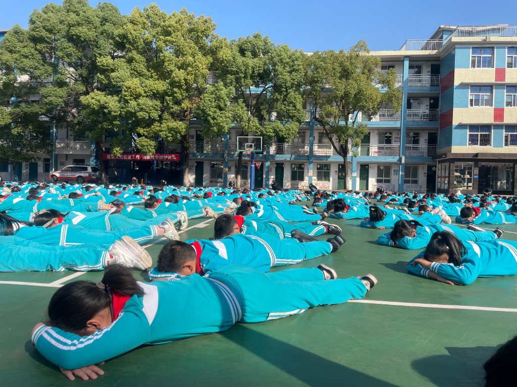 演练现场,随着预先警报声音响起,株洲八达小学全体师生参加演练,按照安全疏散路线,紧张有序的从教学楼撤离,以最快的时间转移到疏散演练场地。整个疏散过程指挥得当、反应迅速、井然有序。几分钟后,空袭警报持续长鸣,所有学生迅速疏散卧倒。随后解除警报开始拉响,全体师生起身列队,此次演练也圆满结束。