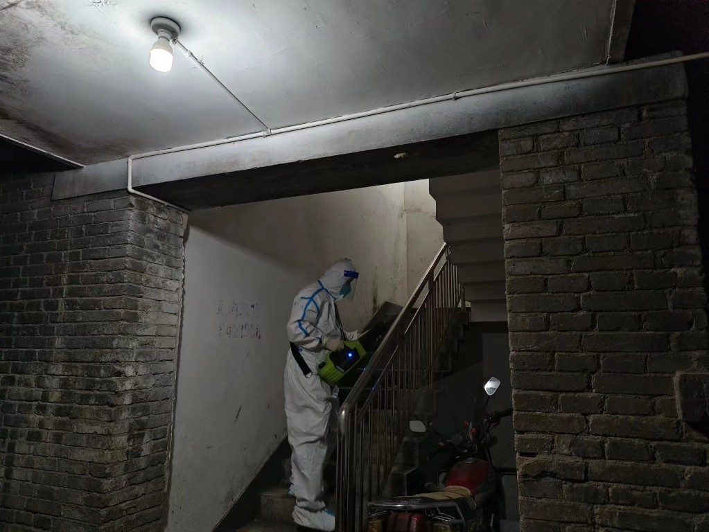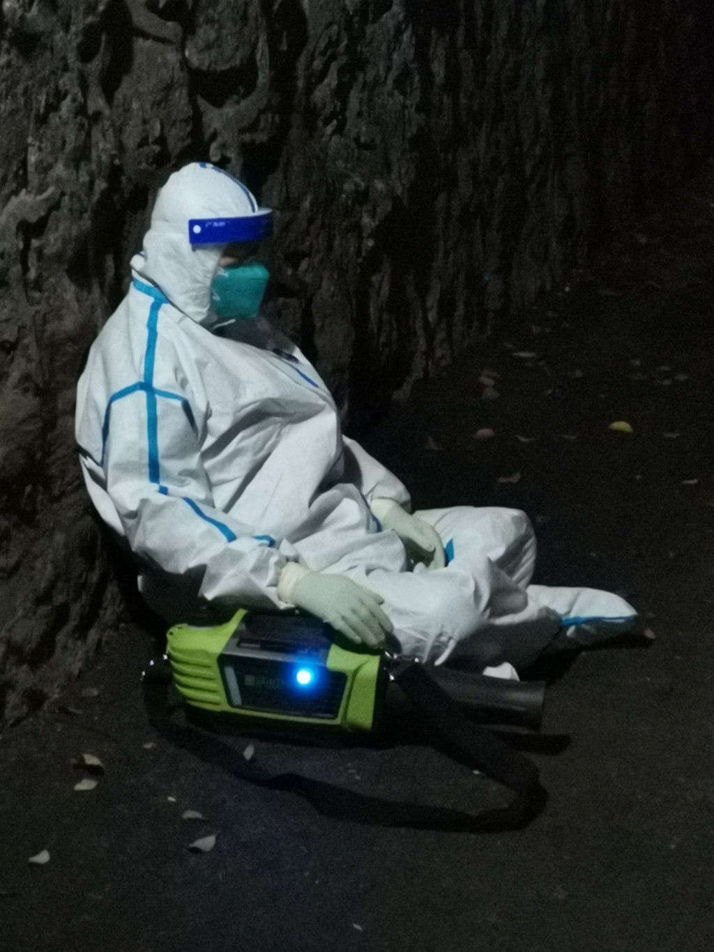 作为疫情防控的中坚力量,消杀组承担着对荷塘区每个核酸检测阳性病例、密切接触者、次密切接触者的居住场所、活动场所、周围环境等相关疫源地现场消毒处理的重任。他们一直保持着“深夜集中行动、凌晨完成工作、全天随时待命”的工作状态,一旦接到疫情消杀处置的指令,就迅速集结,戴齐全身防护用品,用最快的速度到达现场。一天凌晨,他们接到了对一处居民楼的七层住户进行消杀的任务,因为是在老旧小区,他们只能提着沉重的消毒喷雾器,穿着密闭的防护服,戴着口罩、手套和面罩,一个个单元寻找,足足爬了4次七楼才找到目的地,等消杀任务结束,他们只能无力地坐靠在墙角下,防护服内的衣服也早已被汗水浸湿。