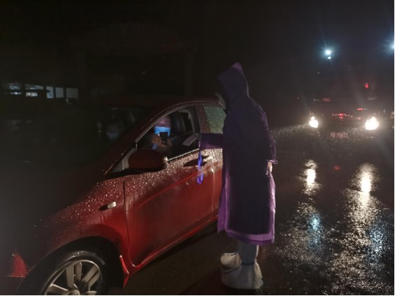 “请扫一下场所码,出示一下健康码、行程码……”仙庾镇工作人员手拿场所码对着每一辆经过的车辆司机说,狂风暴雨中,鞋子打湿了,腿脚嗦嗦发抖,但他们仍然无怨无悔履行自己的职责,有条不紊地开展“一扫二看三查四验”(即扫场所码、看健康码、查行程卡和查验核酸检测阴性证明),指导所有车辆和人员进行报备。