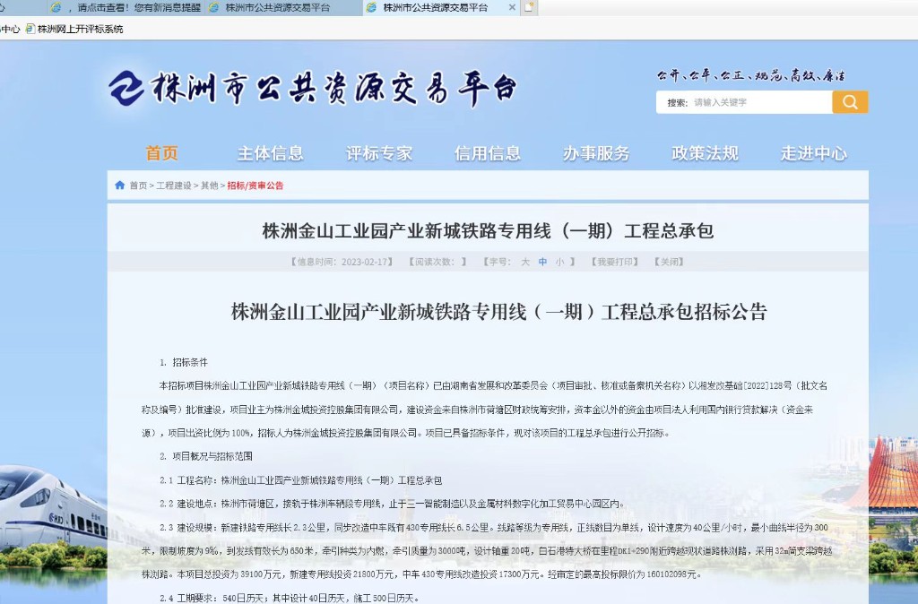 2月17日,株洲金山工业园产业新城铁路专用线一期工程顺利完成设计施工一体化招标挂网。