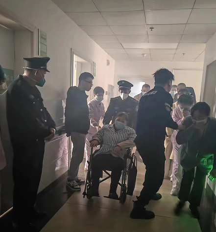 安全员正在组织病人、病人家属及医务人员进行紧急疏散