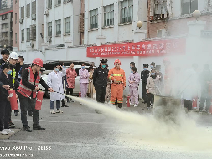 "着火啦、着火啦.......",3月1日下午3时,株洲市人民医院老年病楼六楼传来一阵阵急促的呼叫声和火灾警报音。消防队员、保卫人员紧急出动,只见六楼已经被烟雾环绕,前来救援的消防队员赶紧取来灭火器和消队水枪进行灭火,保卫人员冲入病房,救出受困病人,安全员立即组织其他病房病人及家属、医护人员,按照预先学习的规范动作和预定路线,安全有序地引导大家撤离到安全区域。