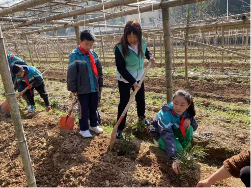 志愿者们兵分三路,一组青年志愿者带领少先队员来到兴塘村丝瓜基地,开展翻地、耕种等活动,通过先锋带头作用带领孩子们感受劳动带来的快乐、领会雷锋的螺丝钉精神。