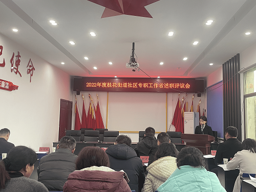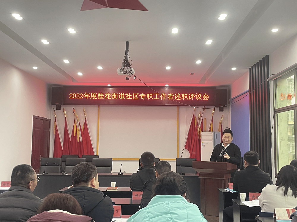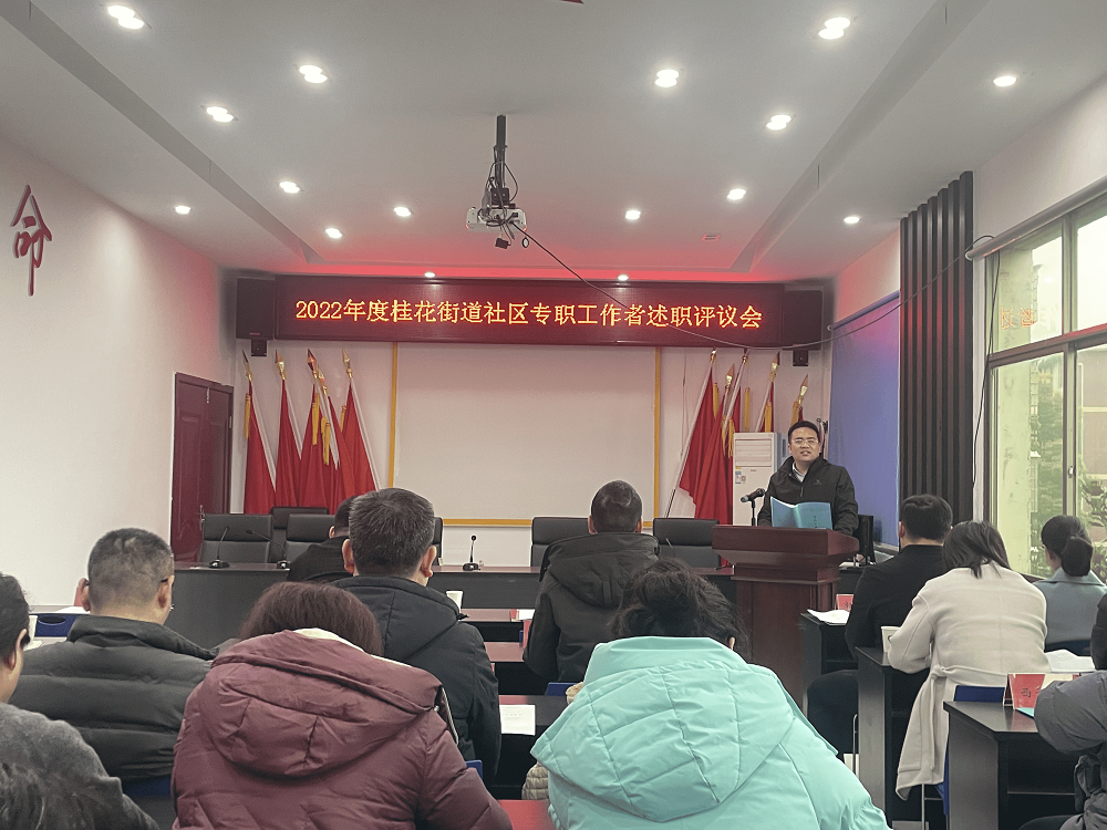 为全面、客观、准确地评价各社区工作者一年来的工作实绩,充分调动社区工作者干事创业的积极性,切实加强基层队伍建设,提高工作效能,提升社区规范化管理水平,以考核促提升,以评价激干劲,3月23日,桂花街道党工委召开2022年度社区工作者述职评议考核会议,街道党政领导班子成员、社区书记、各站办所负责人参加会议。