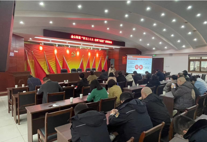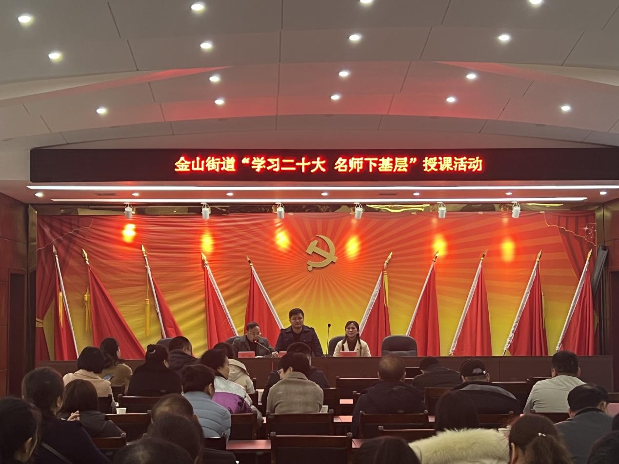 为深入学习宣传贯彻党的二十大精神,以习近平新时代中国特色社会主义思想为指导,金山街道深入开展"作风建设年"活动,团结和引领街道广大党员、群众把思想统一到党的二十大精神上来,按照市委组织部的要求,金山街道现开展"学习二十大 名师下基层"授课活动。街道全体机关干部、各社区(村)"两委"成员及二级支部书记参加。