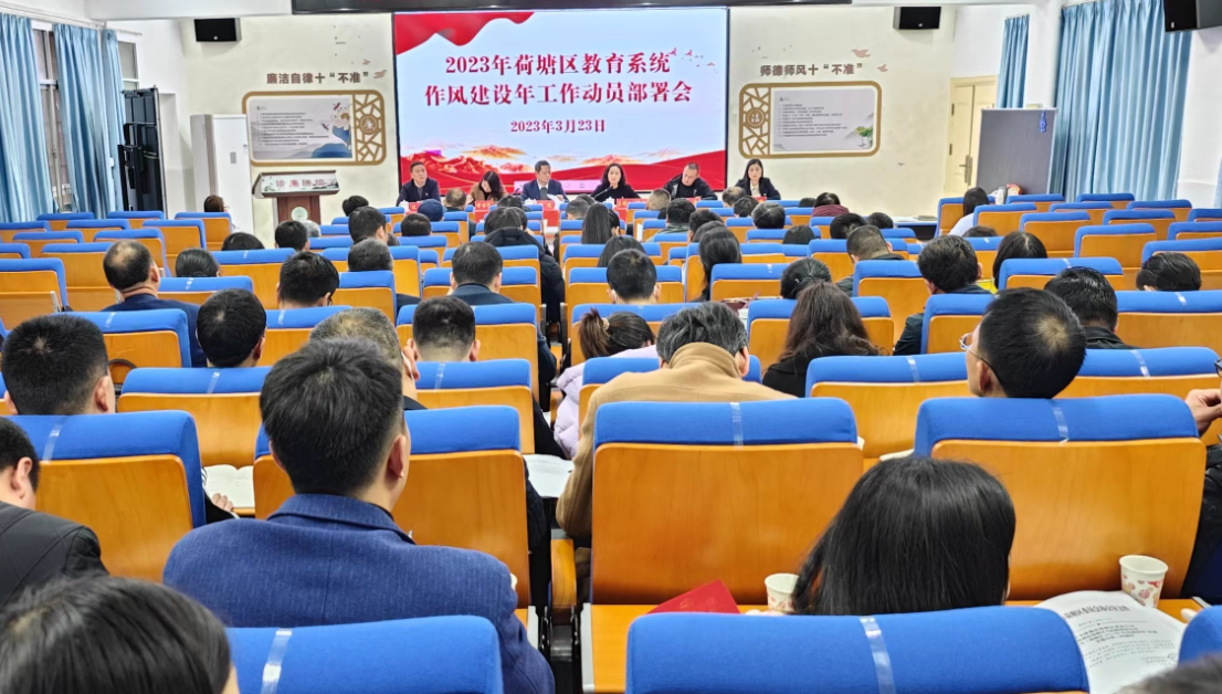 2月23日,荷塘区教育系统2023年作风建设年工作动员部署会在荷塘小学多媒体教室召开,号召全体干部教师坚定不移改进工作作风、强化责任担当,助力荷塘教育高质量发展。区教育局党委书记、局长周波出席会议并讲话。区教育局领导曾云艺、田勇、过斌、吴健参加会议。会议由区教育局党委副书记、副局长潘书巧主持。