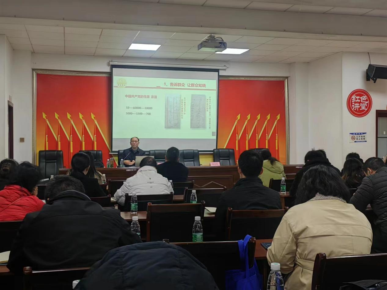 3月28日,株洲市委组织部“学习党的二十大 名师下基层”活动走进荷塘区宋家桥街道天台村新时代文明实践站,宣讲团讲师廖雄斌为宋家桥街道党员干部作《从红军标语中追寻初心》专题讲座。宋家桥街道办事处领导干部、村(社区)书记、辖区党员60余人参加学习。