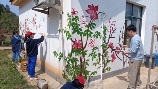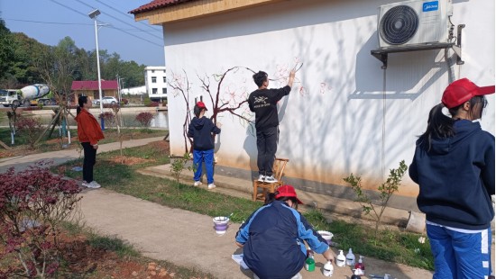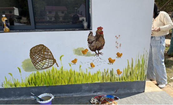 墙绘地点选择在樟霞村集体经济项目——生态公园休闲屋,内容主体为树木花鸟,围绕乡村治理、志愿服务、移风易俗等题材,融合乡村与校园的特色元素,按照墙面处理、图案确定、调色、上色和维护等环节进行创作。大家根据时间安排,分阶段分区域进行绘画,将文明城市创建的理念融入乡村生活,擦亮乡村振兴底色。