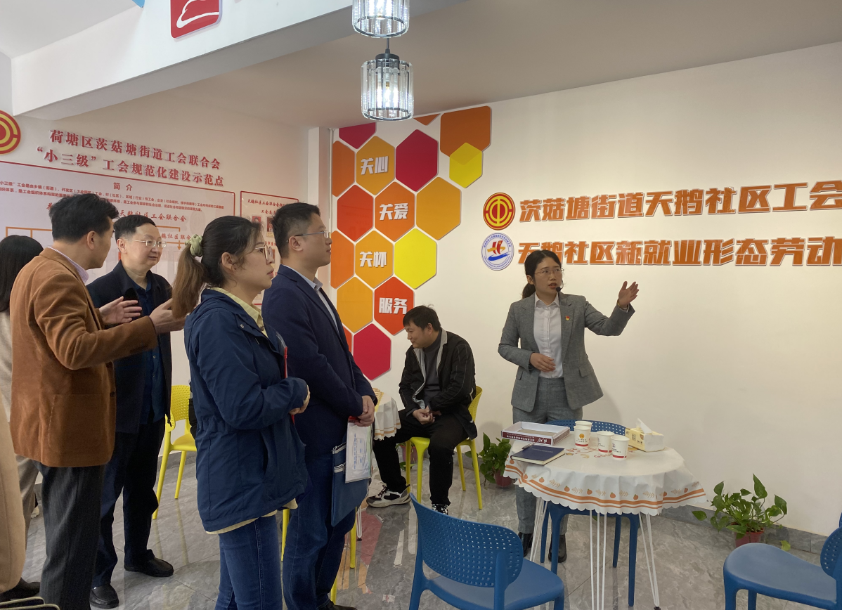 调研组一行来到茨菇塘街道天鹅社区工会联合会,听取社区工会负责人关于新就业形态劳动者建会入会、服务职工、开展活动等方面的工作成效汇报,并实地参观天鹅社区新就业形态劳动者之家。