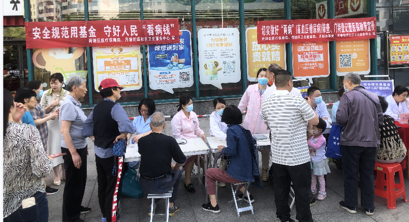 活动现场通过悬挂横幅、发放宣传折页、设立咨询台、义诊的方式开展。月塘社区卫生服务中心全科医生团队为来往的居民开展专家义诊、健康咨询、免费血压、血糖测量等服务。对于居民朋友关心的高血压、糖尿病、特殊门诊以及职工医保统筹门诊的报销政策给予耐心细致地解答。为提高宣传效果,除了本次活动的主会场,辖区协议医疗机构及零售药店均在各点以发放宣传折页、播放电子显示屏等方式进行了宣传。