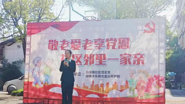 4月26日上午,株洲市荷塘区金山街道石宋路社区党总支结合"一月一课一片一实践"活动,联合夕乐苑大金山养护院在404队小区开展"敬老爱老享党恩·社区邻里一家亲"文艺惠民活动,弘扬敬老爱老中华民族传统美德。石宋路社区党总支书记薛颖玉致辞。