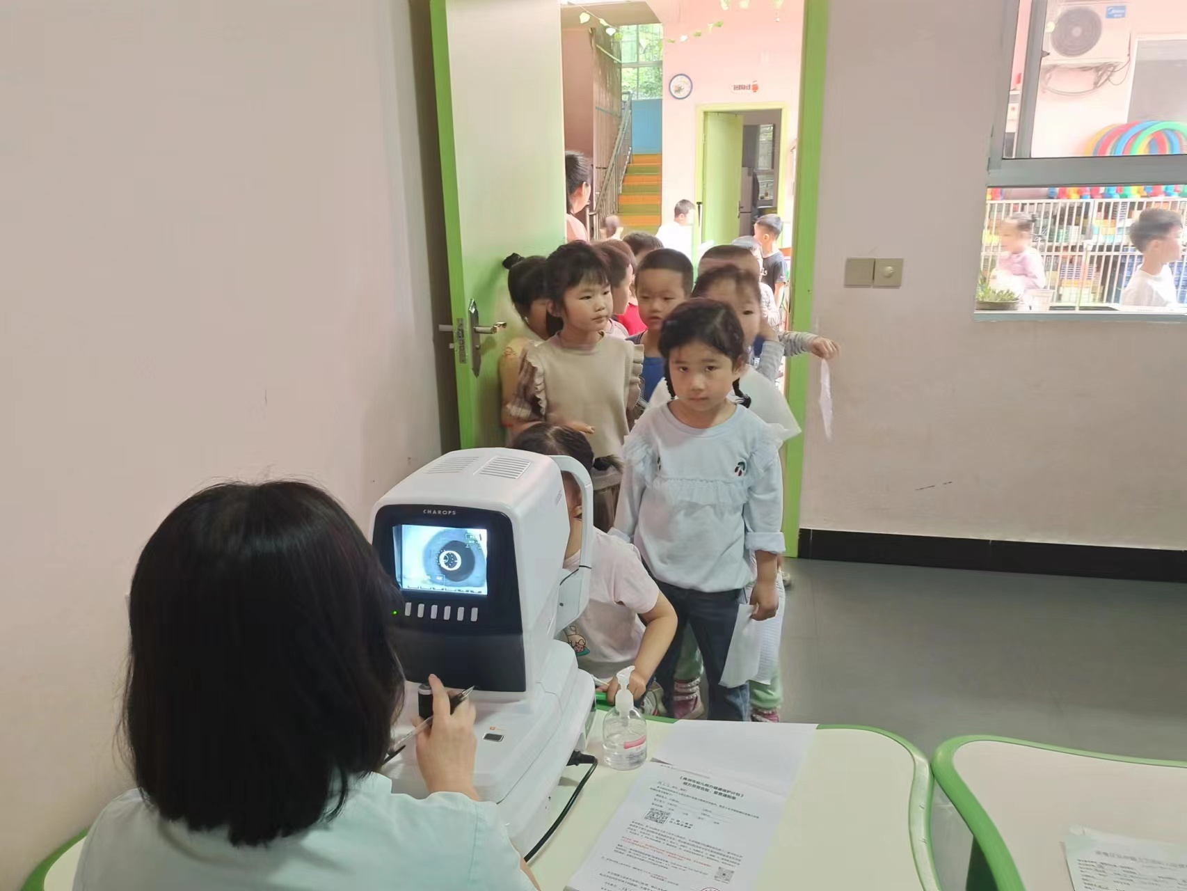 专业眼科医生对每位小朋友进行了认真的检查,查看了视力,检查了眼睛的外观有无红肿,再看眼球大、小是否一致,瞳孔是否居中对称,同时做了早期屈光筛查,了解幼儿们目前眼睛屈光度是否符合其生理年龄,屈光度的筛查也能提前知晓幼儿患弱视、近视的风险有多高,为儿童的视力保健提供早期的预防措施。