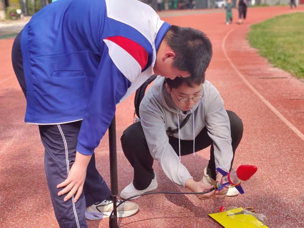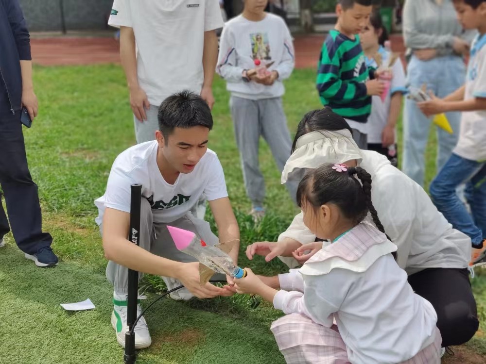 首先,志愿者老师为孩子们介绍了水火箭的发射原理,带领孩子们进行“水火箭”制作,用瓶子将“燃料舱”与“载荷舱”完美结合。一个个水火箭模型制作完成后,孩子们进行实地发射,随着一枚枚水火箭的腾空而起,让孩子亲身感受了物理科学的趣味性;随后,志愿者和孩子分组齐心协力完成了趣味运动接龙挑战,深刻感受克服困难、合作共赢以及运动带来的快乐。