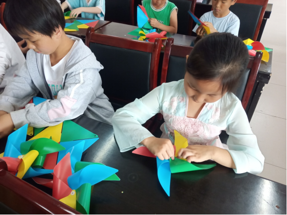 孩子们掌握了操作方法后,马上就投入了“组装工作”,一个个精致别样的小风车就这样在孩子们的小手下“诞生”,孩子们高兴得拍起了小手。你帮我拿风车裁片,我帮你拿组装卡圈,“你看我做得比你快呢!”“我也很快啊!”小朋友们相互配合又相互比拼,小脸上都是张扬的兴奋。 “没‘纸’了,阿姨,没‘纸’了!”“没‘钉子’啦!”小朋友们大声的向阿姨们呼喊着,脸上是开心、快乐又调皮可爱的表情,“好呐!马上到!”听到阿姨们回应他们,孩子们笑得更开心了。