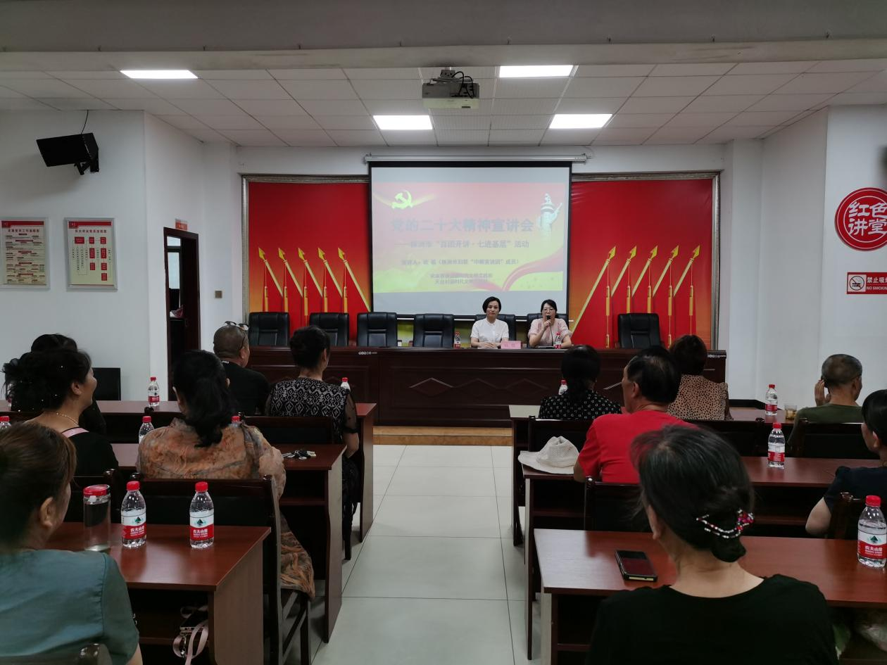 为进一步推动习近平新时代中国特色社会主义思想和党的二十大精神学习宣传贯彻走深走实,打通理论宣讲“最后一公里”,7月17日,株洲市党的创新理论“百团开讲•七进基层”走进荷塘区宋家桥街道天台村新时代文明实践站,本次特邀株洲市妇联“巾帼宣讲团成员”欧禧为大家宣讲党的二十大精神,辖区党员及志愿者约30人参加。