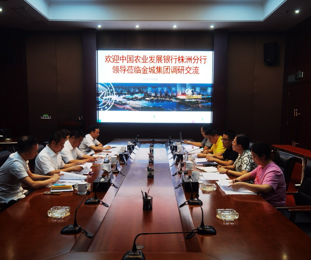 7月26日,中国农业发展银行株洲分行行长刘亚湘一行来金城集团就深化银企合作进行交流洽谈。金城集团党支部书记、 董事长王佳佳,党支部副书记、总经理周威等相关人员参加会议。