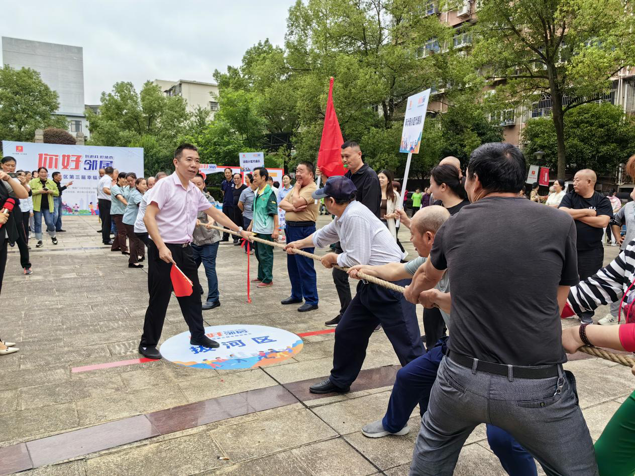 其中,最热闹的要属拔河比赛了,比赛活动以各小区居民代表组队参与,参赛队伍共有8支,抽签分组决定比赛顺序,活动裁判则邀请了株洲市发展和改革委员会驻小区工作队成员胡荣担任。随着裁判员一声哨响,现场气氛迅速紧张热烈起来,参赛队员们心往一处想、劲往一处使、拧成一股绳,斗志昂扬、齐心协力,为赢得拔河比赛顽强拼搏。场边助威的群众也全力呐喊为他们加油,比赛进行得如火如荼,难分上下。经过8轮的循环赛和4轮的淘汰赛后,活动决出拔河比赛获奖队伍:第一名检察院小区代表队、第二名荷塘税务局小区代表队、第三名石子头社区微尘志愿者服务队。
