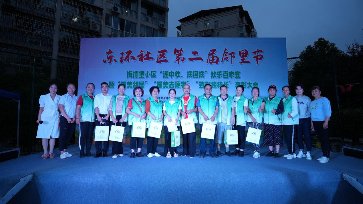 在中秋、国庆双节来临之际,9月24日,东环社区海德堡小区党支部联合小区业委会、永诚物业服务有限公司举办“迎中秋、庆国庆”欢乐百家宴暨“最美邻居”、“最美志愿者”、“致敬楼栋长”表彰大会,市派驻小区第一书记市委党校人事部副部长谭圣辉,工作队队员苏海新、区派驻小区第一书记区城管局副局长李伟斌、区志愿者联合会会长田颖、永诚物业服务有限公司总经理何新华等参加活动。