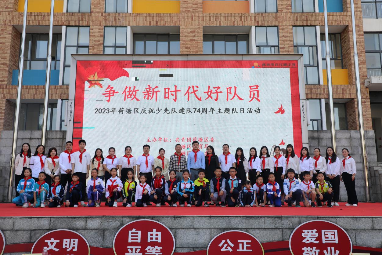 10月16日,文化路小学开展"争做新时代好队员"2023年荷塘区庆祝少先队建队74周年主题队日活动。荷塘区副区长罗曼、区教育局党委书记、局长周波、共青团荷塘区委书记罗宇祥、共青团荷塘区委副书记谭奕等参加活动。