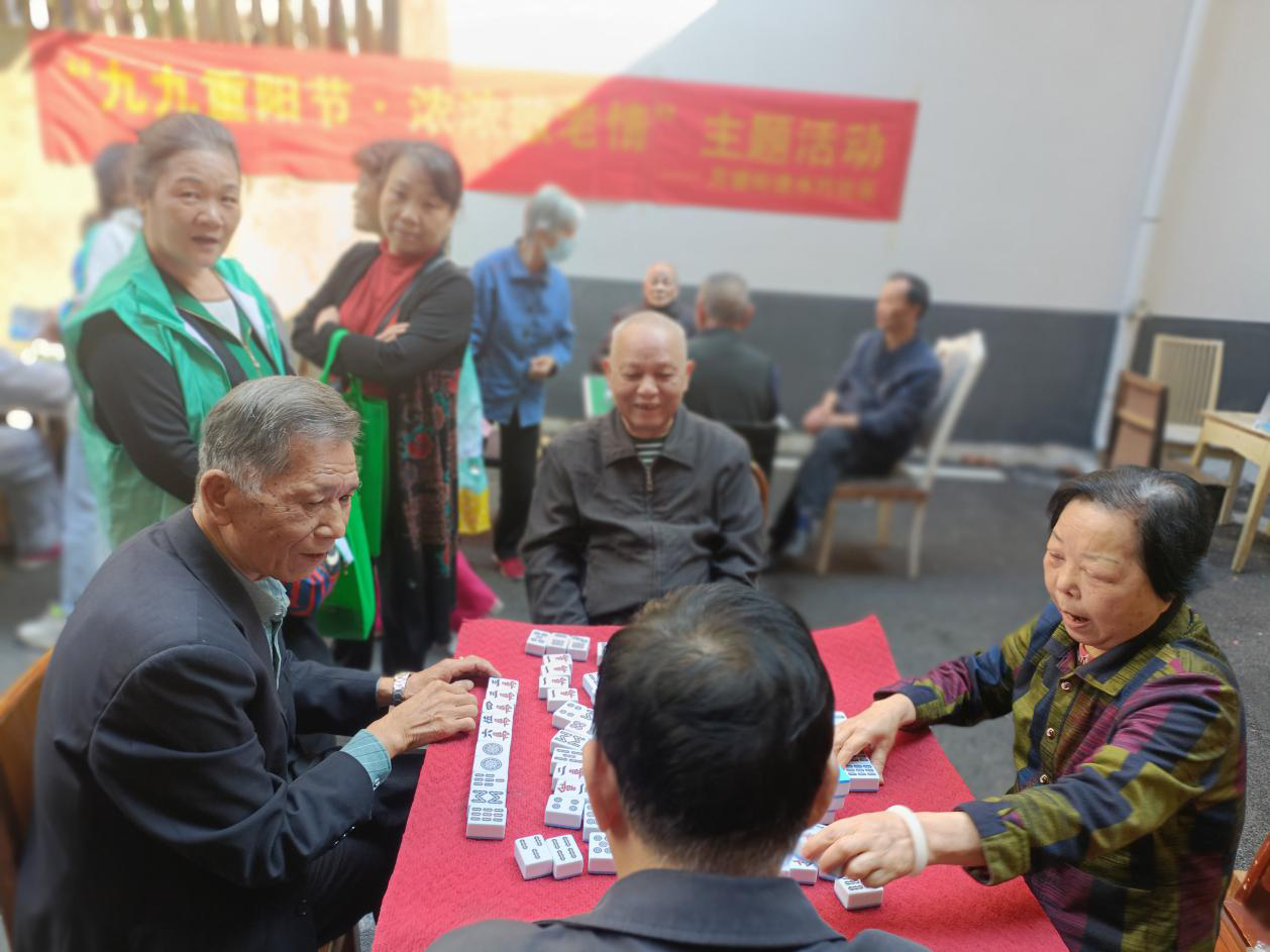棋牌比赛“邻”里和。水竹社区在各小区开展的重阳节麻将、扑克牌娱乐比赛活动、石子头社区开展的邻里扑克牌比赛,均得到了老人们的积极响应,大家踊跃报名参加。本着“友谊第一、比赛第二”的活动精神,比赛在祥和、欢快的氛围下进行,爽朗的笑声与扑克、麻将声交织在一起,形成了一副紧张而又祥和的美妙画卷。胜者兴高采烈,败者也并没有气馁,大家玩得不亦乐乎。