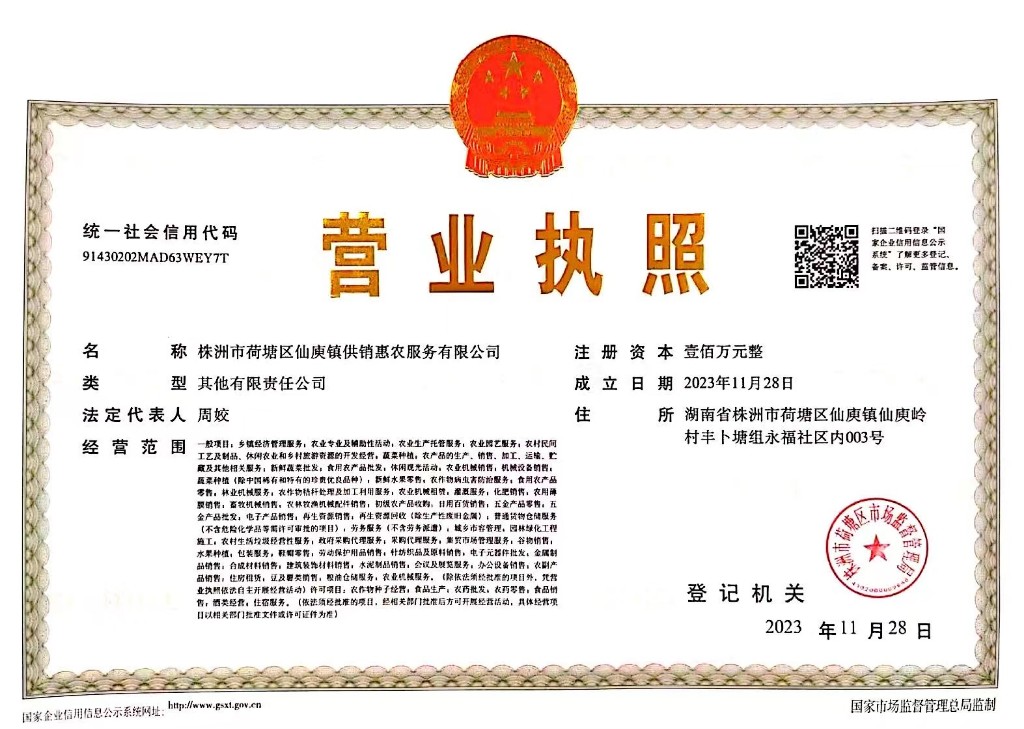 11月28日,株洲市荷塘区仙庾镇供销惠农服务有限公司正式成立,成为我区首家完成工商注册登记的基层供销组织。
