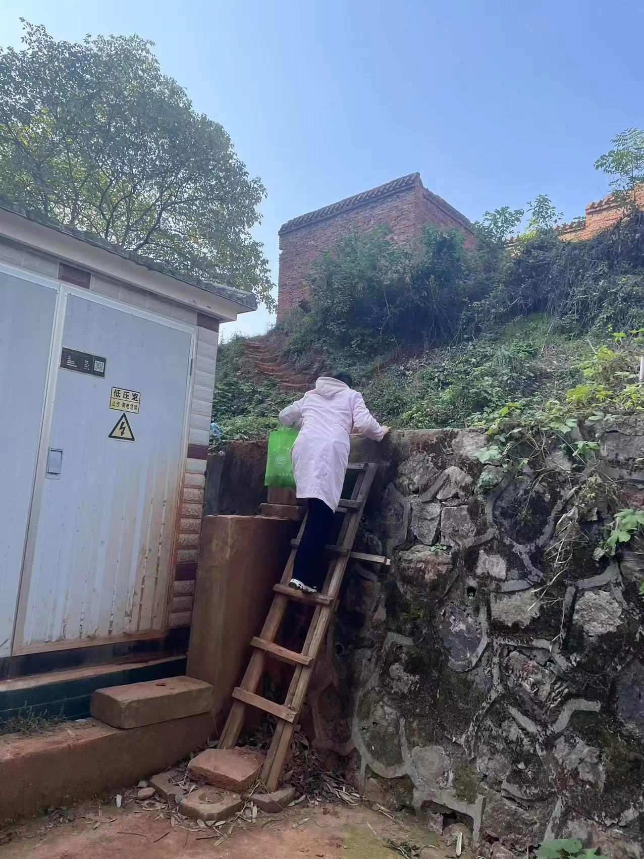 11月27日下午,何云飞团队和往常一样,骑着电动车开展入户随访工作,走到提前电话预约的倪志荣爷爷家,发现大门紧闭,敲门无人回应。邻居对何云飞医生说:“他们两口子在那边山上种菜去了”,何云飞团队顺着邻居指的路,爬上了一个破旧的木梯子后穿过一排排整齐的石阶,再绕过一座崎岖不平的山路,不远处看到了倪志荣夫妇。“倪爷爷,我们来给你测血压了”何云飞医生亲切地喊着,倪志荣夫妇看到何医生和护士“跋山涉水”地来到菜地里给他们夫妇进行随访、测血糖、血压,感动得流下了眼泪。