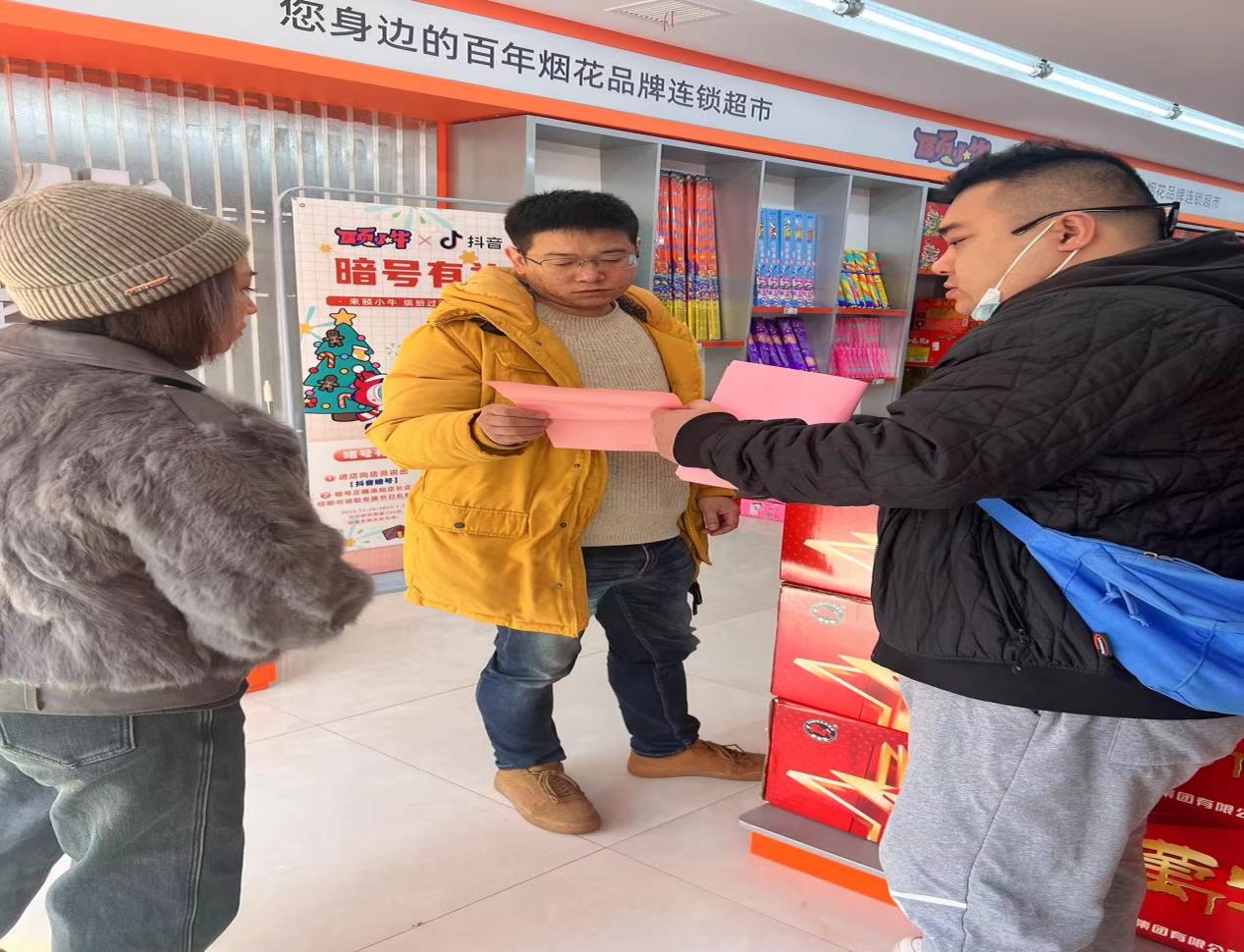 机关干部与社区工作人员一起向辖区门面发放"致辖区居民的一封信",向居民宣传用火用电安全知识。