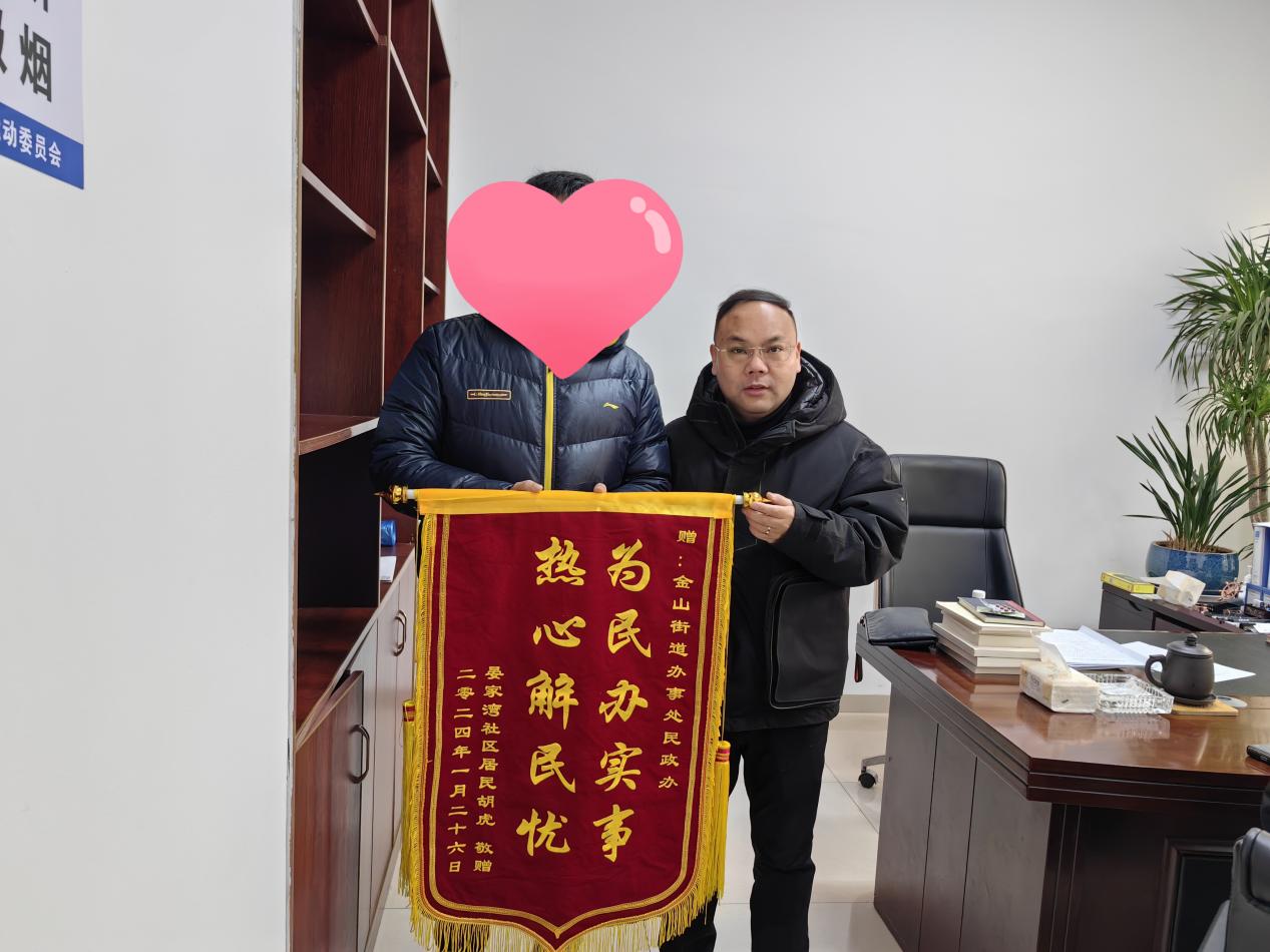 "为民办实事,热心解民忧",金灿灿的大字在红彤彤的锦旗上格外引人注目。1月26日,金山街道办事处和晏家湾社区迎来了一位特殊的访客一一胡先生。她手捧一面精美的锦旗,脸上洋溢着感激的笑容,以此表达他对金山街道办事处领导的关心与帮助、以及晏家湾社区工作人员长期以来尽职尽责、心系群众为民服务的感激之情,向在场的所有人员一一鞠躬表达感激之情。