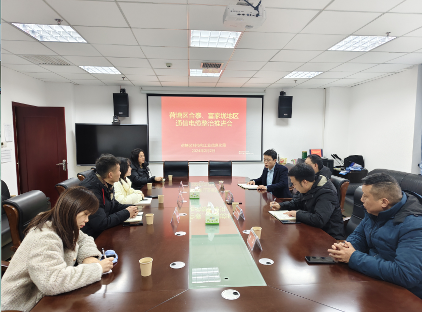 2月2日上午,区科工信局组织召开合泰、富家垅地区通信线缆整治推进会,市工信局、区科工信局、月塘街道、移动通信株洲分公司相关负责人参加会议。