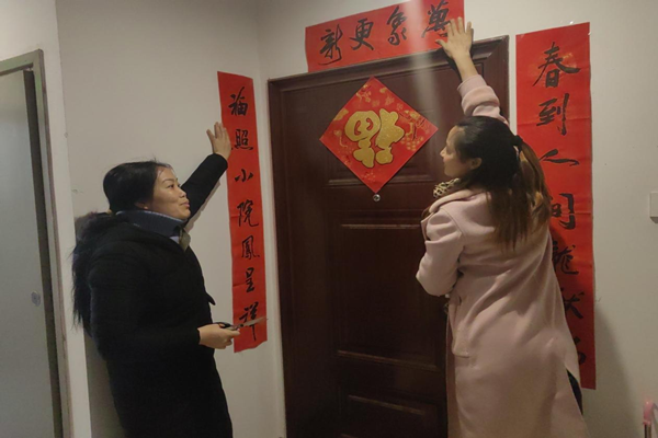 志愿者们还为其它独居老人贴春联,为有需要的居民送对联。