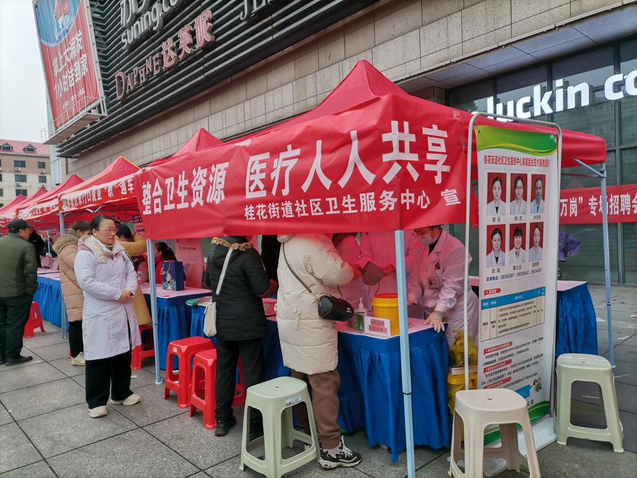 2月23日,荷塘区第八届园区企业招聘会在桂花街道大润发前坪火热开幕,桂花街道社区卫生服务中心趁此热潮大力宣传国家公共卫生服务项目。