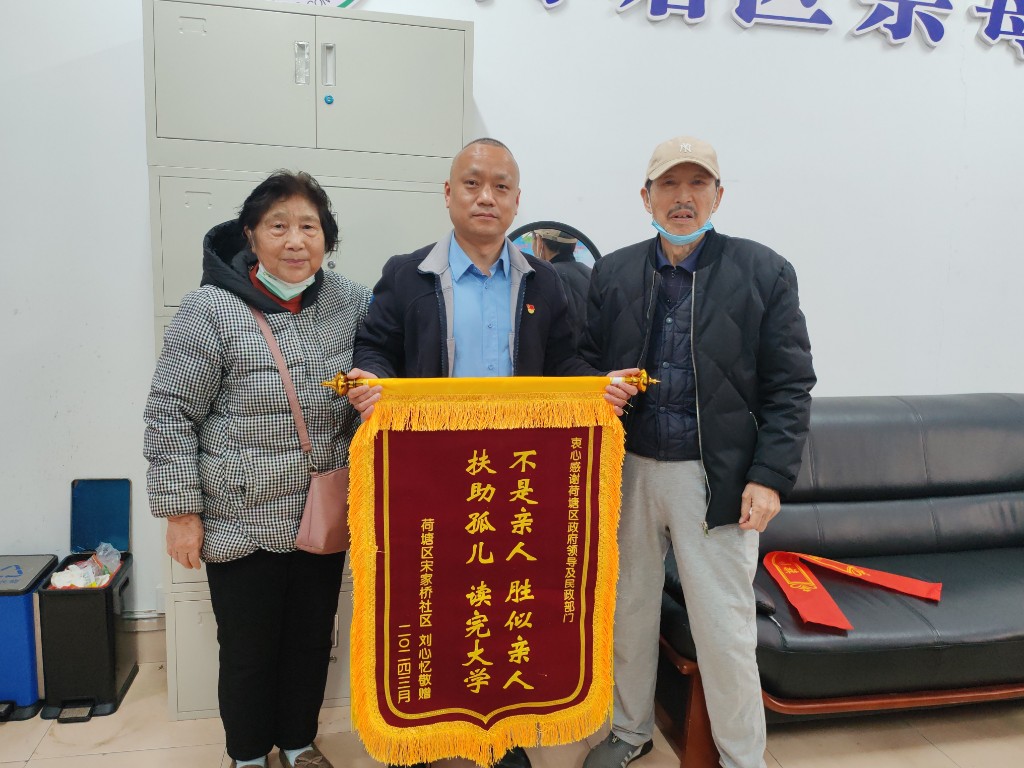 3月14日,大学本科毕业不久的孤儿刘某忆在其爷爷奶奶的的陪伴下,来到株洲市荷塘区民政局,将一面“不是亲人胜似亲人 扶助孤儿读完大学”的大红锦旗赠与区民政局,表达困难孤儿对党和政府的感恩之心。